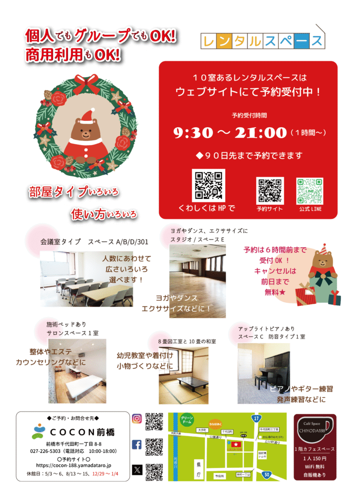 なお、夜間利用は消灯と戸締りをご利用の皆さまにお願いしております。また、18時以降はオートロックが作動いたします。暗証番号を前日にメールまたはLINEでご連絡いたしますので、ご確認をお願いします。はじめて夜間利用をする方は必ずCOCON前橋からのご連絡メールを受信できるようにしてくださいますようお願いいたします。