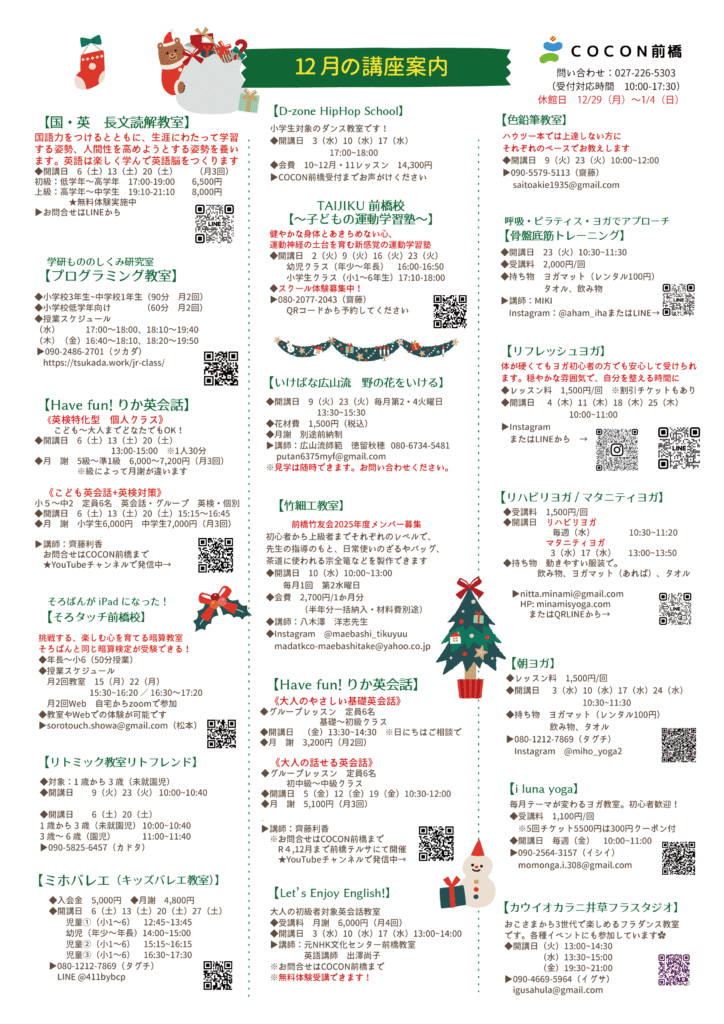 見学や体験もできますので各講師またはCOCON前橋にお問い合わせください。