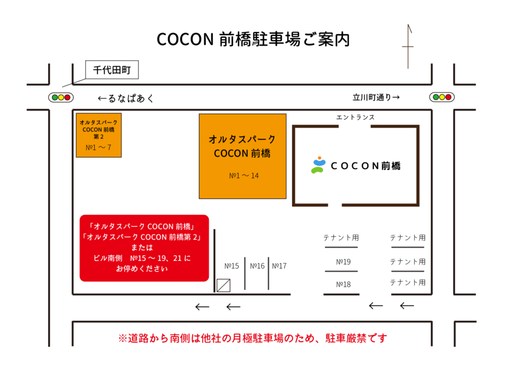 投稿日: 2026年1月29日駐車場に変更があります 2月1日(日)から、南側スペースの№21がテナント用となります。 COCON前橋ご利用者は№15~19をご利用ください。 混雑時はコインパーキングの「オルタスパークCOCON前橋」をご利用ください。