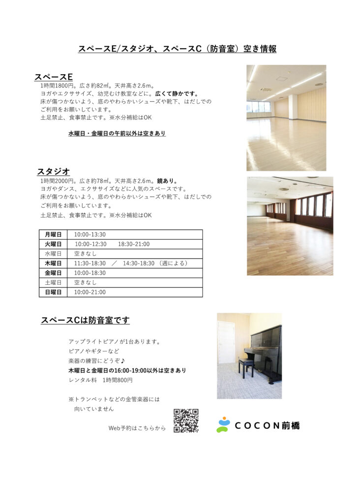 水曜日と金曜日の午前以外は空きがありますので、定期利用を検討中の方にお勧めです。※階下が事務所スペースのため、足音が響くダンス・体操教室などにはご利用できません